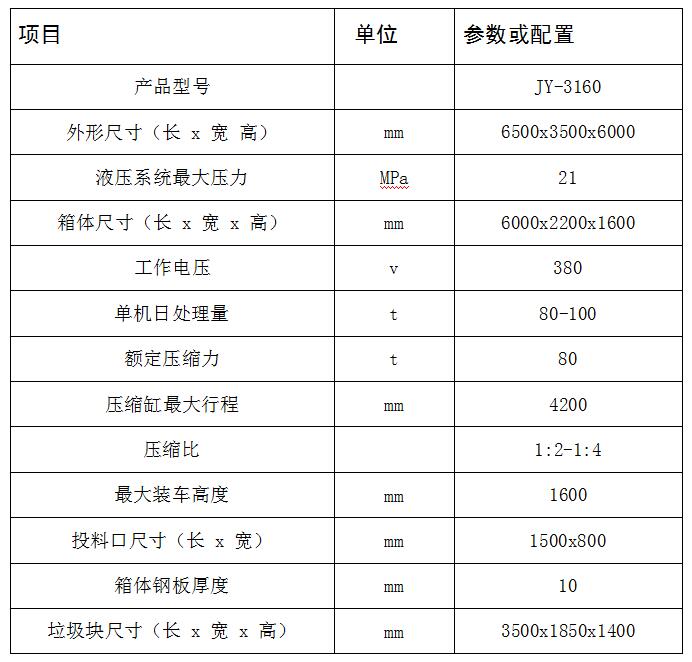 JY-3160 水平式四柱舉升垃圾壓縮設(shè)備主要用于對城鎮(zhèn)內(nèi)小區(qū)、居民點、學(xué)校、醫(yī)院、公園景區(qū)、廠礦和機關(guān)院校的生活垃圾以及固體廢棄物的收集、壓縮減容和封閉轉(zhuǎn)運。