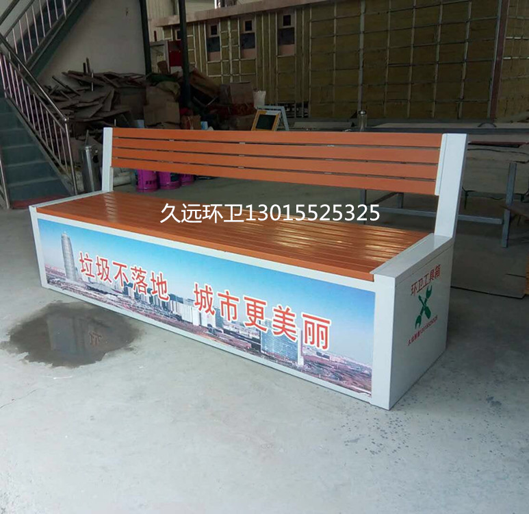 環(huán)衛(wèi)工具箱:也叫保潔員工具箱,環(huán)衛(wèi)工具座椅,保潔員休息座椅,市政保潔箱等。工具箱常用尺寸為:長2400*寬500*高550mm,也可以做成2米,2.4米,2.7米等,寬度和高度也可以定做,滿足不同客戶、不同場所的使用要求。